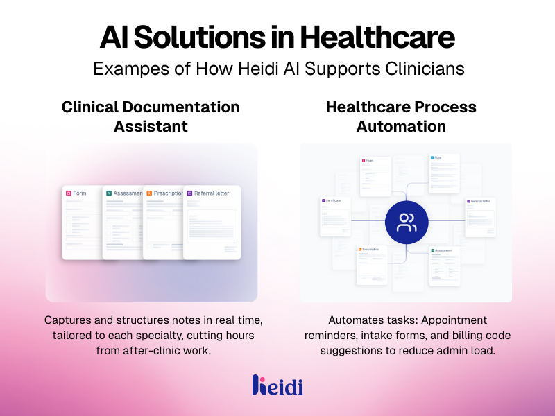 Two of the most impactful AI applications in healthcare are process automation and clinical documentation assistance. Below, we explore how Heidi delivers both in a compliant and actionable way.